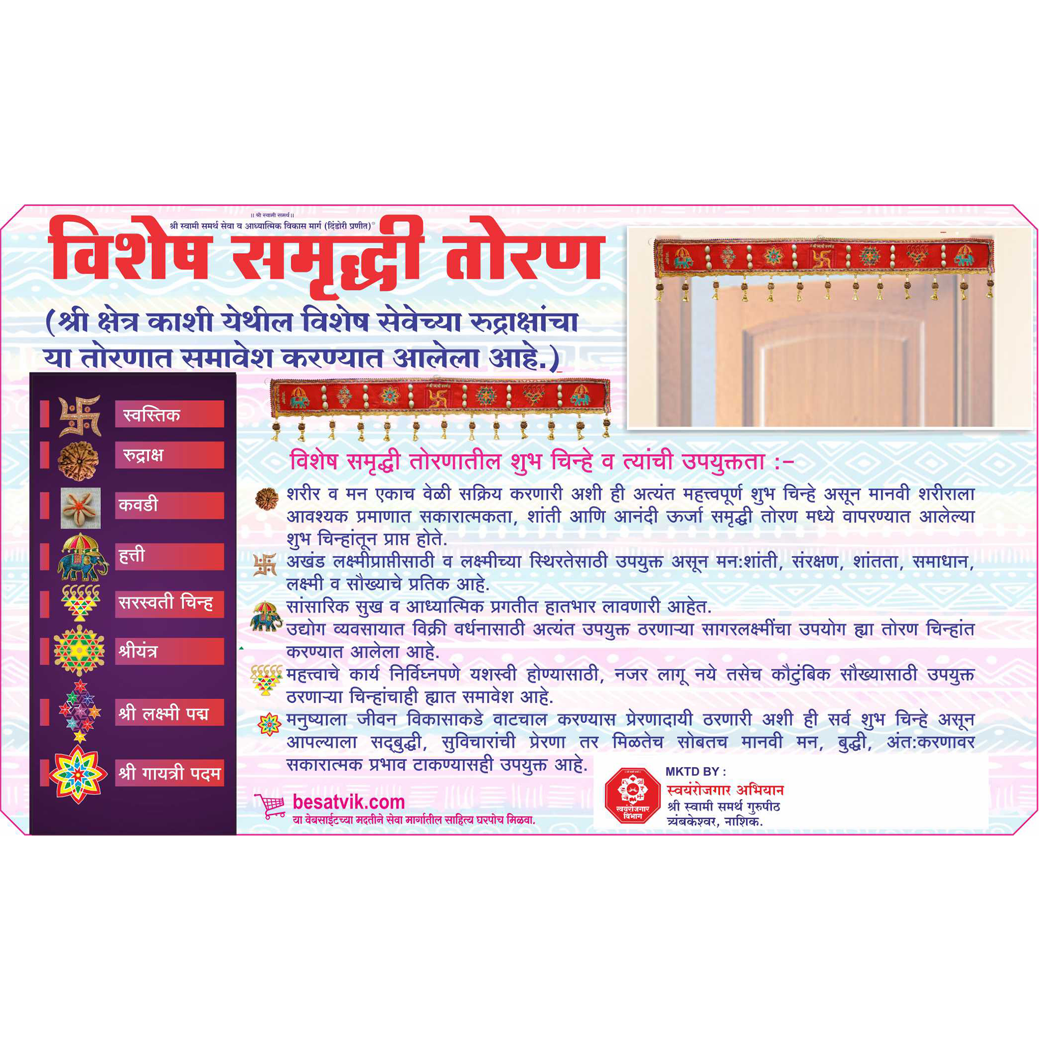 (श्री क्षेत्र काशी येथील विशेष सेवेच्या रुद्राक्षांचा या तोरणात समावेश करण्यात आलेला आहे.) शुभ चिन्हे- कवडी, कमळ, रुद्राक्ष, कलश, दिवा, असलेले हे उभे तोरण घरात प्रचंड उर्जा निर्माण करते. व्यवसाय वृध्दी, आर्थिक, स्थिरता, मनःशांती देणारे, सर्व कामातील अडथळे दूर करण्यासाठी फलदायी.